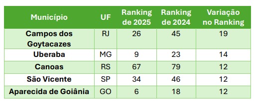 O destaque de maior variação positiva é Campos dos Goytacazes (RJ), que subiu da 45ª posição em 2024 para a 26ª em 2025. De acordo com os dados do SINISA (2023), verificou-se um aumento de 1,02 pontos percentuais no atendimento de água e de 4,34 pontos percentuais no atendimento de esgoto, atingindo as metas de 99% e 90%, respectivamente, estabelecidas pelo Marco Legal. Além disso, o tratamento de esgoto aumentou em 5,31 pontos percentuais, acompanhado de uma redução no indicador de perdas na distribuição (de 45,96%, em 2022, para 34,13%, em 2023) e por ligação (de 341,45 L/lig/dia para 300,52 L/lig/dia).
